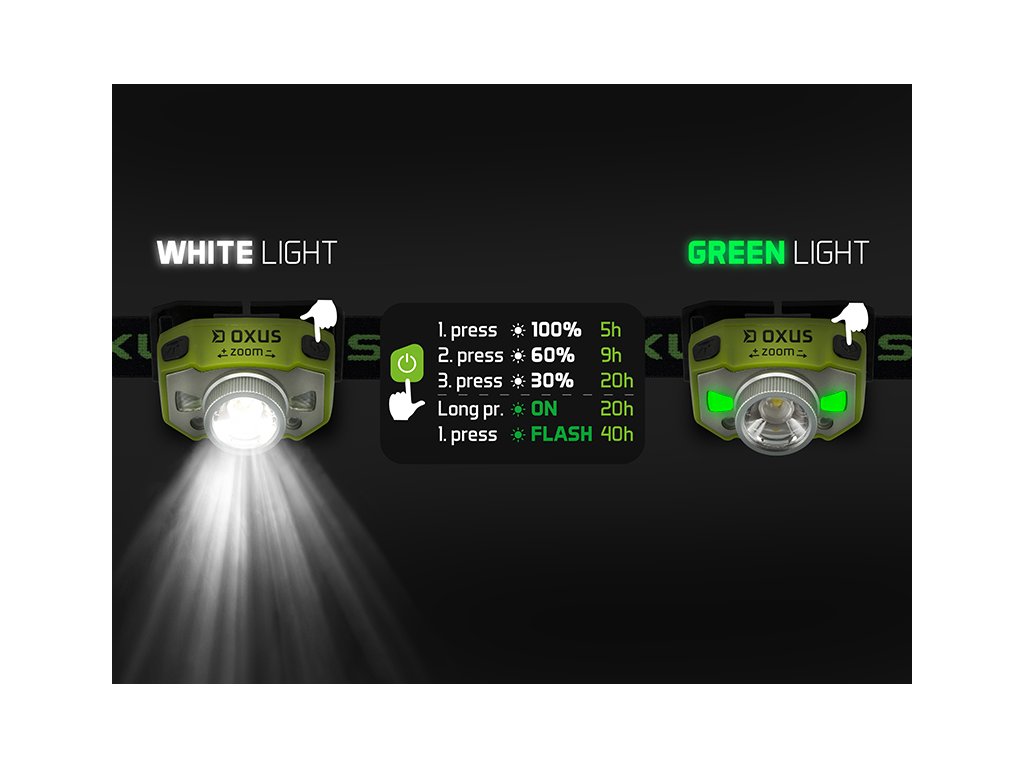 Čelová lampa poskytujúca rôzne režimy svietenia, ale najmä nastaviteľný svetelný lúč, vďaka ktorému si dokážete posvietiť aj na objekty vo väčšej diaľke. Čelovka disponuje výkonom 5 W a svietivosťou až 300 lm. Vďaka týmto parametrom a možnosti fokusovania svetelného lúča tak nebude problém dostatočne osvetliť vaše bezprostredné okolie, ale aj vzdialené ciele. OXUS ZOOM je vybavená pohybovým senzorom, čím ju poľahky zapnete a vypnete mávnutím ruky. LED diódy ponúkajú možnosť bieleho alebo zeleného svetla. Pri prvom kliknutí spínacieho tlačidla sa čelovka rozsvieti bielym svetlom na 100%, pričom jej výdrž v tomto režime bude 5 hodín. Druhým kliknutím bude biele svetlo svietiť na 60% s 9 hodinovou výdržou. Pri treťom kliknutí sa biele svetlo stlmí na 30% a vydrží svietiť až neuveriteľných 20 hodín. Dlhším podržaním rovnakého tlačidla sa rozsvietia bočné zelené diódy s výdržou 20 hodín. Opätovným krátky stlačením sa aktivuje blikanie zelených diód. Práve zelené svetlo nepriťahuje otravný hmyz a rozhodne ho oceníte aj počas zdolávania rýb, ktoré sa plašia omnoho menej ako pri osvietení bielym svetlom. Batéria má kapacitu 1200 mAh a nabíja sa pomocou USB-C kábla, pričom jej plné nabitie bude trvať približne 4,5 hodiny. OXUS ZOOM je možné pohodlne polohovať smerom hore a dole a vďaka dĺžkovo nastaviteľnému elastickému popruhu bude dokonale sedieť na každej hlave. Technické parametre: Zdroj svetla: LED Výkon: 5W, 300lm Batéria: 1200mAh, 3.7V Rozmery: 65x35x47mm Hmotnosť: 76g Nabíjanie: USB-C