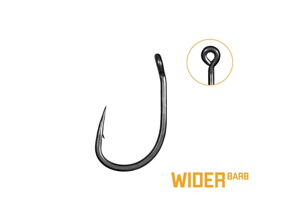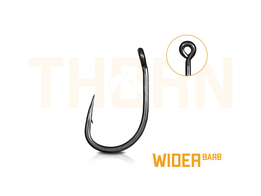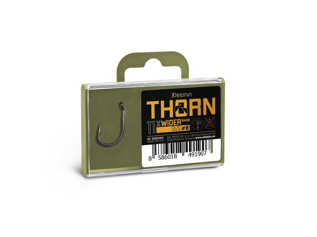 Delphin THORN je prémiová rada kaprárskych háčikov najvyššej kvality. Vďaka moderným technológiám, ktoré boli použité pri výrobe sú tieto háčiky synonymom nekompromisnej pevnosti a maximálnej ostrosti. Háčiky zo série THORN disponujú titanX povrchovou úpravou, čím nadobúdajú matný šedý povrch, ktorý je navyše dokonale hladký pre ľahké preniknutie do kaprej tlamy. TitanX sa stará taktiež o spevnenie a odolnosť celého háčika. Pomocou aplikovanej technológie Ultrapoint 4.8, bolo možné vytvoriť dlhší hrot, ktorý poskytuje priam neuveriteľnú ostrosť. Háčiky Delphin THORN sú balené v praktickej krabičke, v ktorej bude ich ostrie vždy dôkladne chránené. Na krabičke sa navyše nachádza držiak s očkom na zavesenie do predajní, ktorý je možné poľahky odstrániť odlomením bez akéhokoľvek nástroja, vďaka čomu krabička vo vašej výbave zaberie podstatne menej miesta. THORN Wider je špecifický svojím priam už legendárnym tvarom typu wide gape. Ide o háčik charakteristický širším oblúkom a rovným ramienkom. Vďaka týmto parametrom ide o veľmi univerzálny a spoľahlivý háčik, ktorý je možné využiť pri rôznych nadväzcoch a nástrahách. Technický parameter: háčik osovo rovný