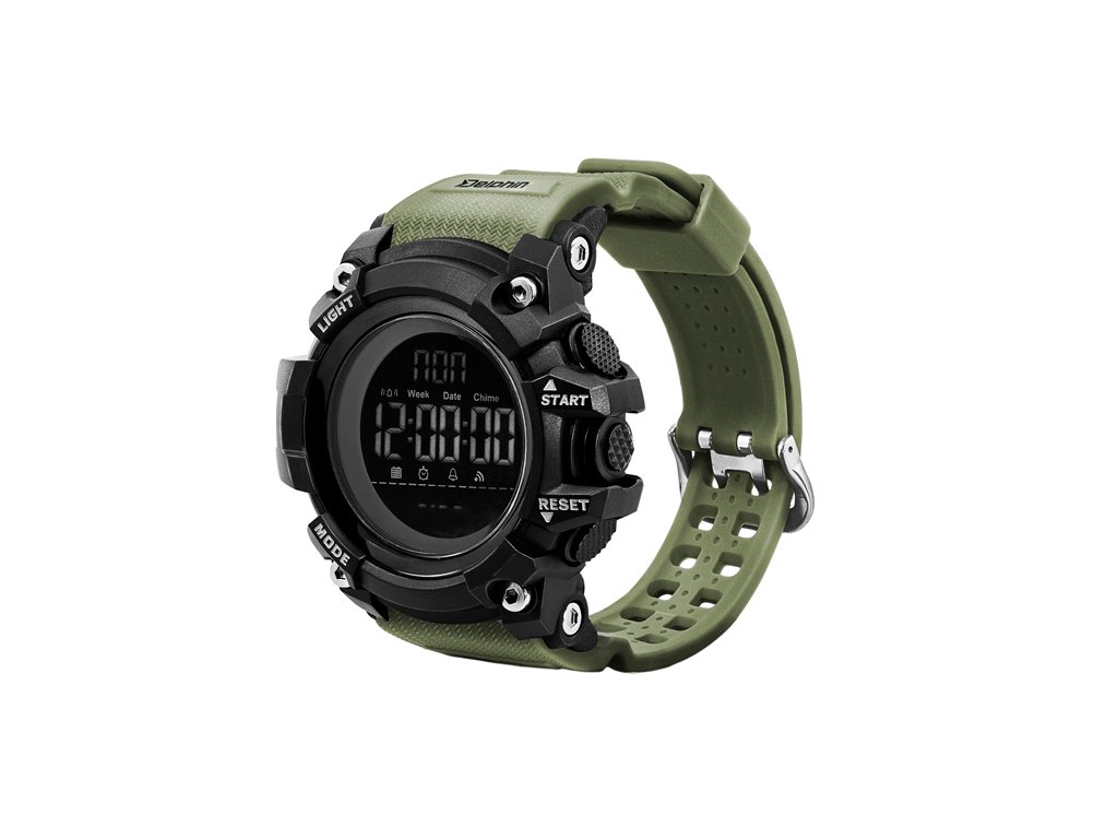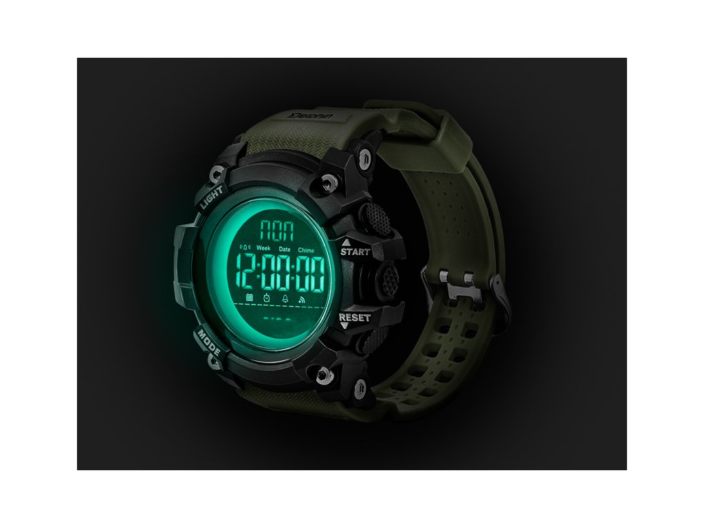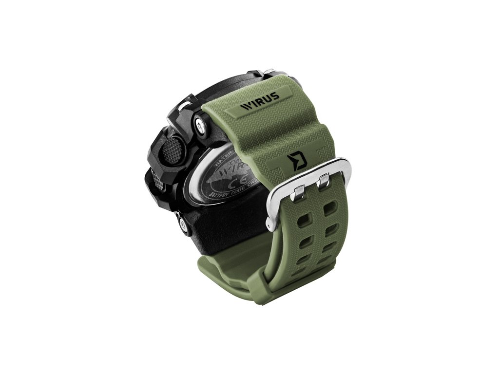 Nadupané digitálne hodinky s množstvom užitočných funkcií, ktoré sa vďaka svojmu robustnému prevedeniu budú vynímať na každom zápästí. Svojím dizajnom sa dokonale hodia všetkým skutočným lovcom, či už ide o rybárov, poľovníkov, ale taktiež všetkým aktívnym ľuďom. Zároveň sa stanú štýlovým doplnkom pri bežnom nosení a pri akejkoľvek inej príležitosti. Hodinky Delphin WIRUS okrem bežnej indikácie času disponujú niekoľkými skvelými funkciami ako budík, časovač, stopky, voliteľný 12 a 24H formát či duálny čas. Taktiež je možné pomocou tlačítka Light podsvietenie 13-číselného LCD displeja, vďaka čomu nestratíte pojem o čase ani počas nočných rybačiek, či iných aktivít. Gumený remienok je na dotyk veľmi príjemný a taktiež dĺžkovo nastaviteľný v širokej škále. To zaručuje že sadnú na zápästie akejkoľvek hrúbky. Remienok je navrhnutý v tmavo zelenej farbe čím ideálne zapadne do prírodného prostredia bez toho, aby bol rušivým elementom. Samotné telo hodiniek je čierne a masívne, vyznačuje sa excelentnou odolnosťou voči mechanickému poškodeniu. Podľa medzinárodnej stupnice je tento model označený ako vode odolný do 50m. Toto označenie spĺňa všetky náležitosti hodiniek, ktoré môžu byť krátkodobo vystavené vode, napríklad pri zrážkach či sprchovaní (nesmie byť použitá horúca voda). Zároveň bez problémov zvládnu pózovanie s úlovkom vo vode, kedy sa na krátky čas dostanú do kontaktu s vodou. Technické parametre: Priemer ciferníka: 53mm Batéria: CR2032