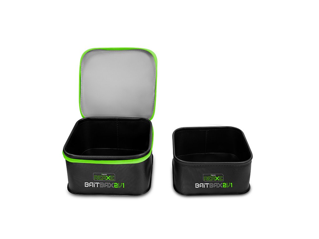 EVA set BaitBAX je čiernej farby v kombinácií s výraznou zelenou grafikou, čím excelentne ladí s inými produktami feedrovej série REAXE. Taštička je opatrená kvalitným zipsom, určeným na kompletné uzatvorenie. Jednotlivé komponenty setu do seba skvele zapadajú, takže po ukončení vychádzky ich viete do seba poľahky vložiť, čím ušetríte miesto vo svojej výbave.