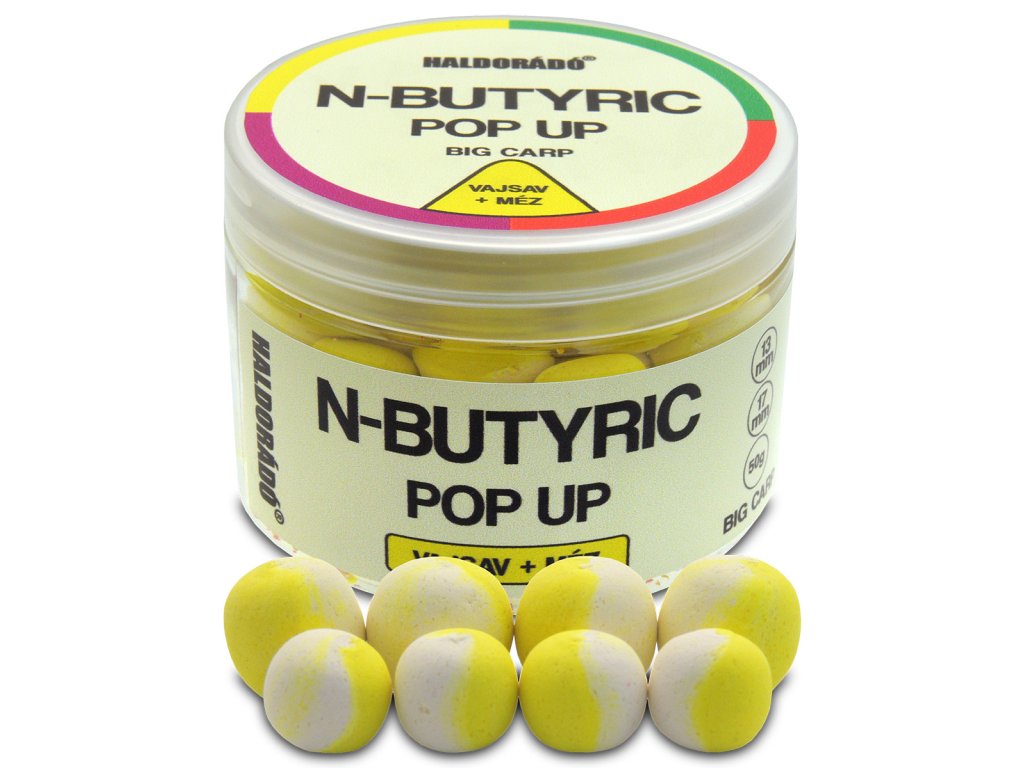 N-Butyric, teda kyselina maslová, má pri letnom love kaprov a amurov veľmi silnú arómu, preto nie je náhoda, že sa už nachádza v mnohých našich produktoch na palete Haldorádó. Videli sme, že nastal čas, aby sa táto chytľavá aróma objavila v našom sortimente v podobe kompletného radu návnad. Návnady s príchuťou N-Butyric sú účinné samy osebe, ale v záujme zvýšenia chytateľnosti sme ich spárovali s osvedčenými, dobre známymi príchuťami. Predávajú sa vo forme guľôčok, v dvoch veľkostiach, vo verzii Method a Big Carp. Nástrahy určené pre method rybárov obsahujú mix ôk 9 a 11 mm, verzie pre kaprárov mix 13 a 17 mm ôk. Aby boli nástrahy pri väčších háčikoch v ideálnej polohe, dostali vysoký vztlak, takže všetky sú Pop Up, teda plávajúce verzie. V sortimente sú 4 rôzne príchute na veľkosť. Ide o Butyric Acid Natural, ktorá je biela, Butyric Acid + Cheese white and orange, Butyric Acid + Med white and yellow, Butyric Acid + Slivka biela a fialová.