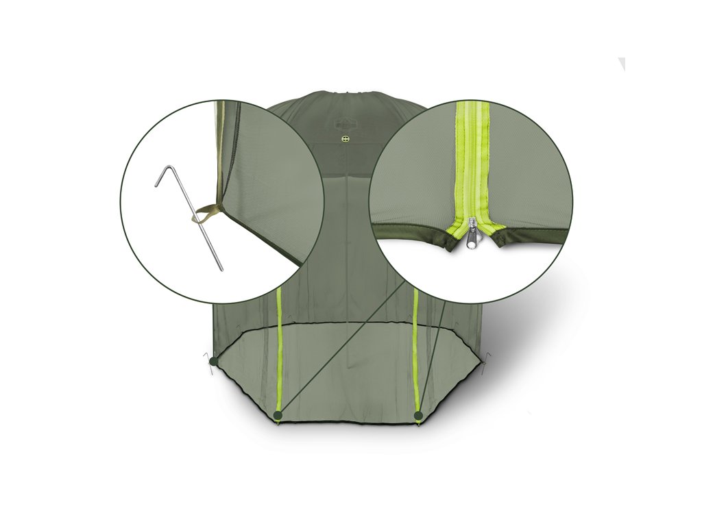 Vysoko efektívna ochrana na brehoch zamorených dotieravým hmyzom! Špeciálne navrhnutá moskytiéra, ktorú je vďaka univerzálnym rozmerom možné uchytiť na drvivú väčšinu rybárskych dáždnikov. Systém uchytenia spočíva v centrálnom otvore na špic dáždnika a v 8 kolíkoch, ktoré sú súčasťou balenia. Vchod sme vybavili dvomi zipsami reflexnej farby, aby sme umožnili ľahšiu orientáciu v noci a pri nepriaznivých svetelných podmienkach. Jemná sieťovina nepustí k Vášmu telu ani jedného neželaného spoločníka. Technické parametre: Priemer moskytiéry: 250cm Výška moskytiéry: 220cm Počet kolíkov: 8