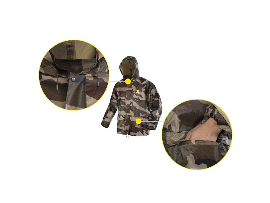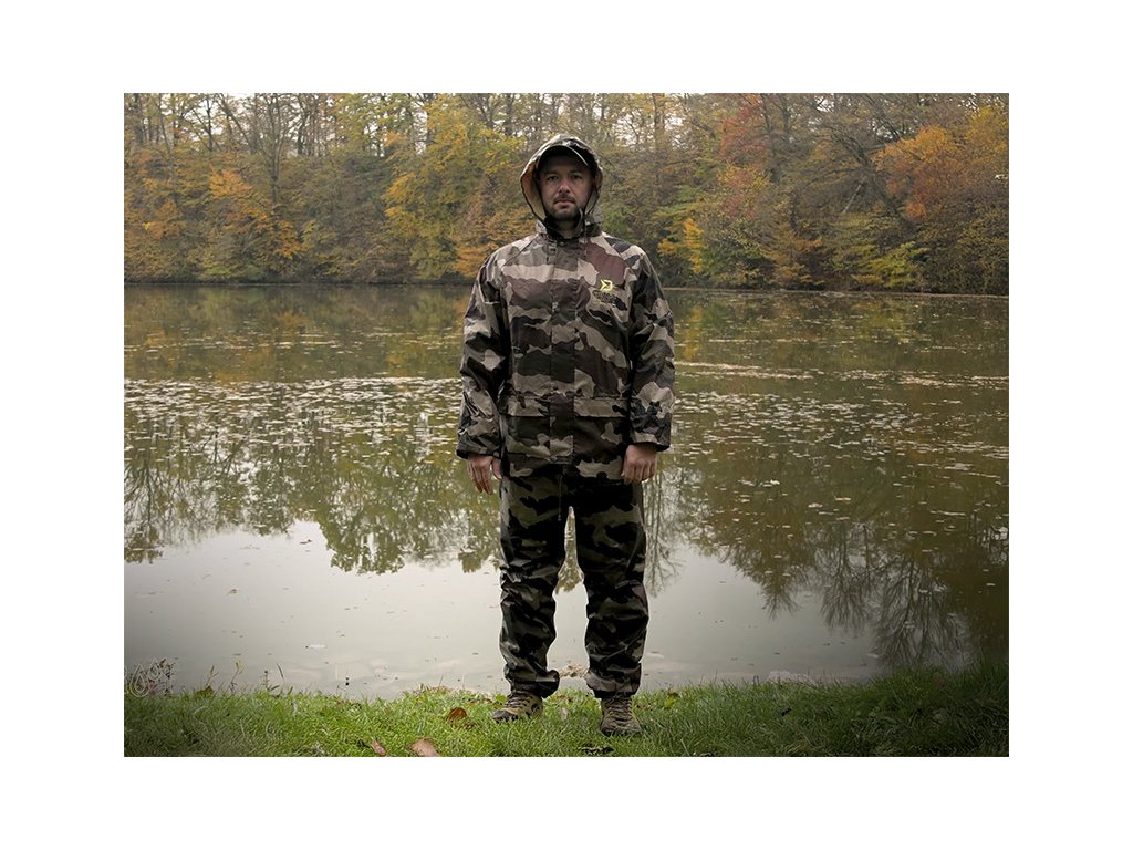 Do daždivých dní je tu nepremokavý komplet Delphin PROOF, ktorý Vás dokonale ochráni pred nepriazňou počasia a prekvapí svojimi kompaktnými transportnými rozmermi. Je vyrobený z vodeodolnej pogumovanej tkaniny s podlepenými švami a maskáčovým vzorom.