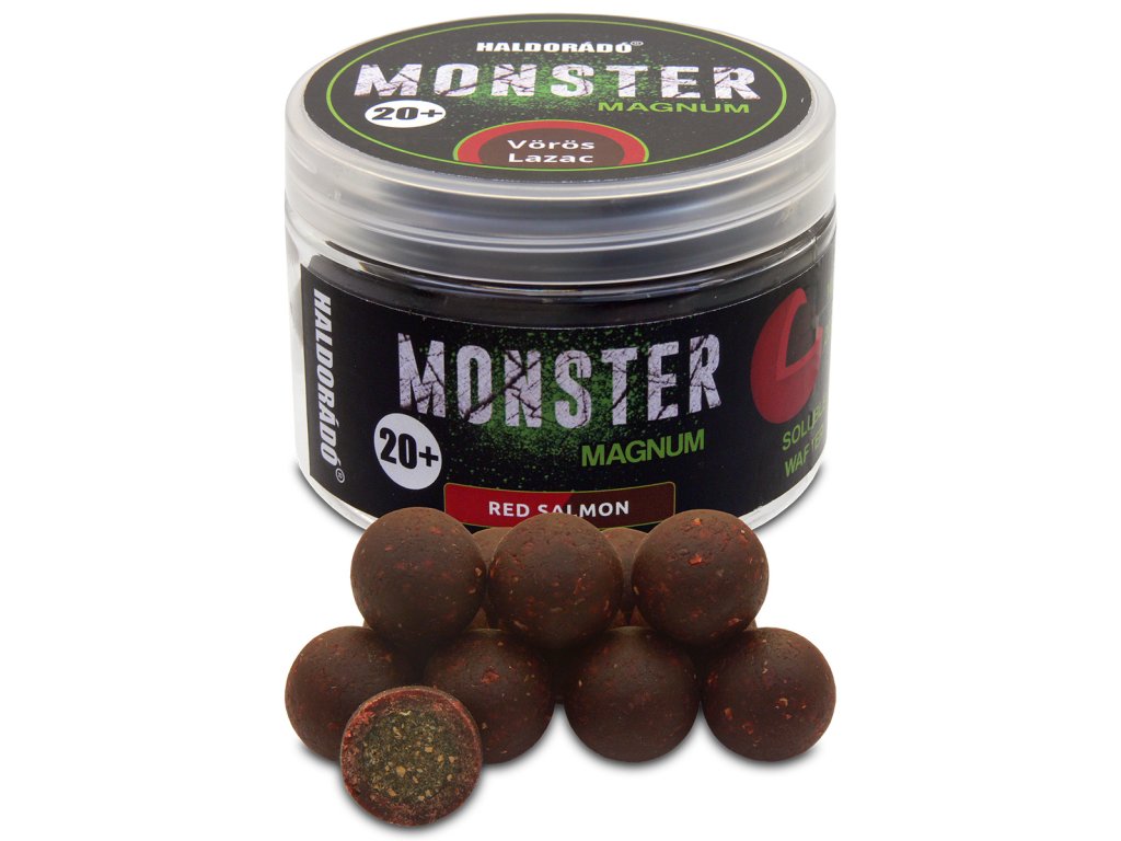 Členovia produktovej rady MONSTER nie sú preslávení príjemnými vôňami, ktoré si môže vychutnať ľudský nos, no ich chytľavosť je nespochybniteľná! Okrem návnad a kŕmnych peliet je jasné, že tento produktový rad nájdete v našej ponuke aj vo forme arómy. MONSTER Magnum má všetky výhody rozpustných a varených nástrah, pretože ide o nástrahu, ktorej stred je varený, ale vonkajšia vrstva je rozpustná! Vnútorné jadro má priemer 14 mm, vyvážené korkom mletá, varená, nerozpustná návnada. Vonkajšia vrstva má hrúbku 6 mm a neustále sa rozpúšťa a uvoľňuje lákavé chute. Jeho používaním sa vyhneme premočeniu našich nástrah, pretože vnútorná, varená časť vydrží až 72 hodín, kým doba rozpúšťania vonkajšej časti je 2-3 hodiny (v závislosti od teploty vody). Veľmi atraktívna, veľmi nápadná nástraha, ktorú je možné použiť pri krátkodobom love veľkých rýb metódou feeder a cieľavedomom love veľkých rýb na boilies. Odporúča sa najmä pri love nátlakových, často chytaných, opatrných, kapitálnych rýb, ale prekvapivo sa osvedčil aj pri love na divokej vode a Dunaji, vyberaní a chytaní kaprov revíru! Je dostupný v štyroch typoch klieští: Jadro Liver & Blood je červené, farba rozpustnej vrstvy je hnedá, jadro Squid & Cranberry je čierne, farba rozpustnej vrstvy je ružová, jadro Red Salmon je tmavo hnedé, farba rozpustnej vrstvy je tmavo bordová a Jadro Hot Mango je oranžové, farba rozpustnej vrstvy je biela.