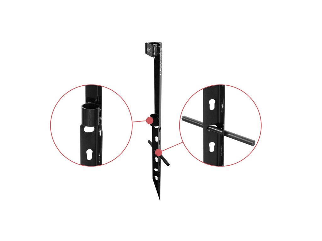 Robustná konštrukcia je vyrobená z kovu, ktorý je odolný voči vonkajším vplyvom a neželanému mechanickému poškodeniu. Spodná časť konštrukcie je vybavená ostrým hrotom, vďaka ktorému poľahky zapichnete stojan aj do tvrdšej pôdy. K lepšiemu zapichnutiu dopomáhajú aj tri výrezy v spodnej časti stojanu, do ktorých môžete pre jednoduchšie zapichovanie vložiť kovovú tyč, ktorá je súčasťou balenia. Vďaka masívnej konštrukcii zostane stojan Delphin EXTREME po zapichnutí do zeme stabilný a pevne osadený na svojom mieste.
